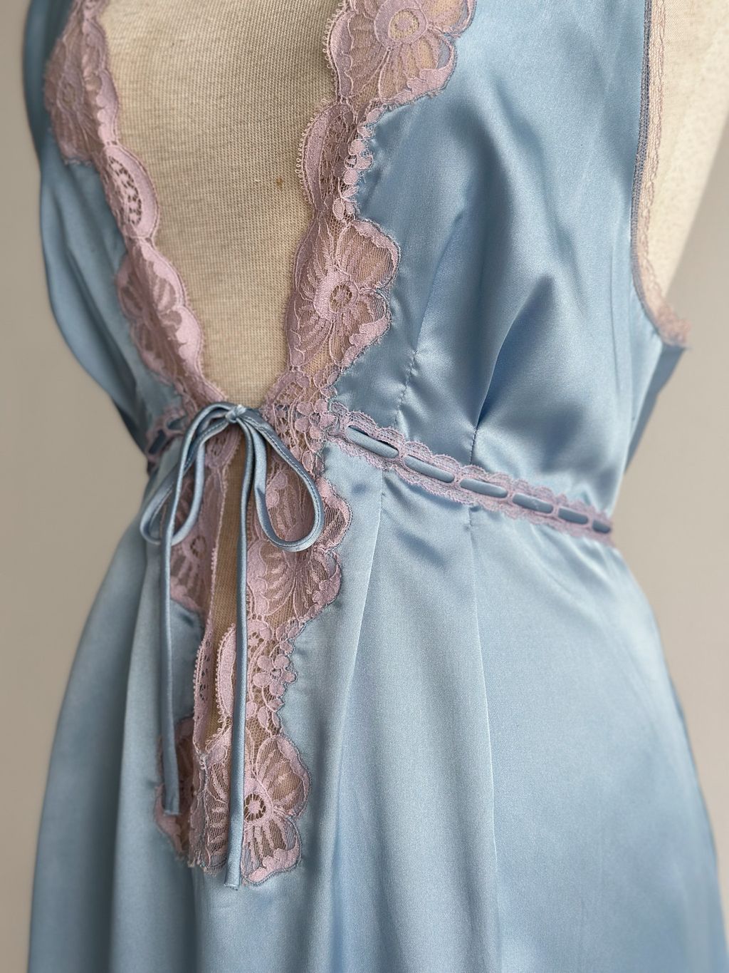 In a cascade of luxurious navy blue satin, this vintage Christian Dior nightgown whispers elegance and romance. Delicate taupe dusty purplish lace traces the deep neckline, embracing the silhouette with poetic grace. A gentle tie cinches & close the waist, creating an ethereal flow that dances with every movement. Ribbon slot lacing along the waist. This gown is a timeless serenade, capturing the essence of dreamy nights and vintage allure. Features non-adjustable straps.