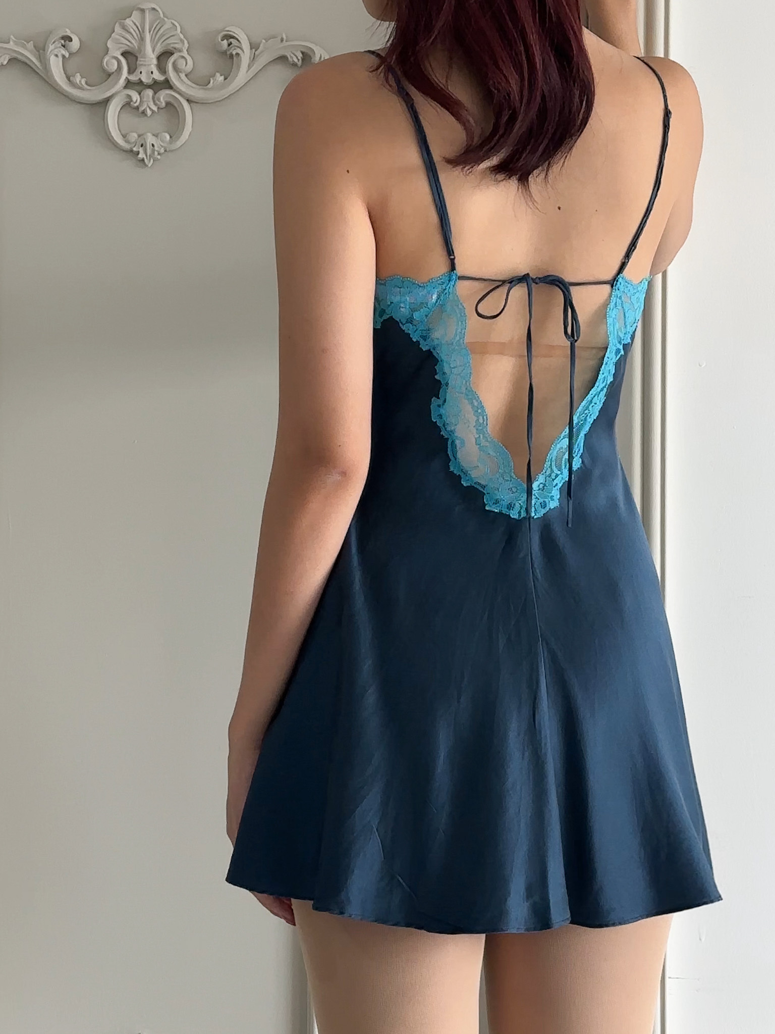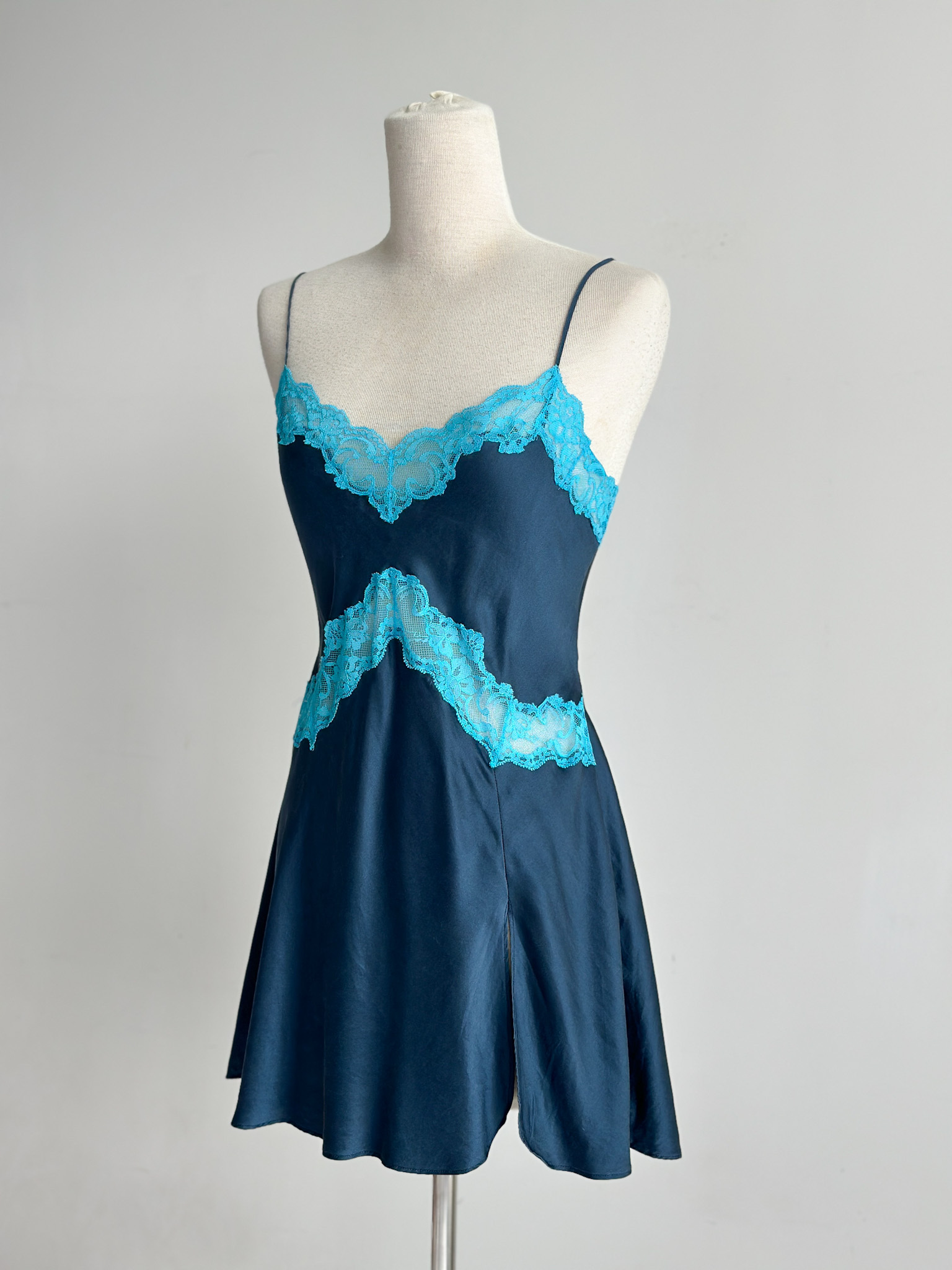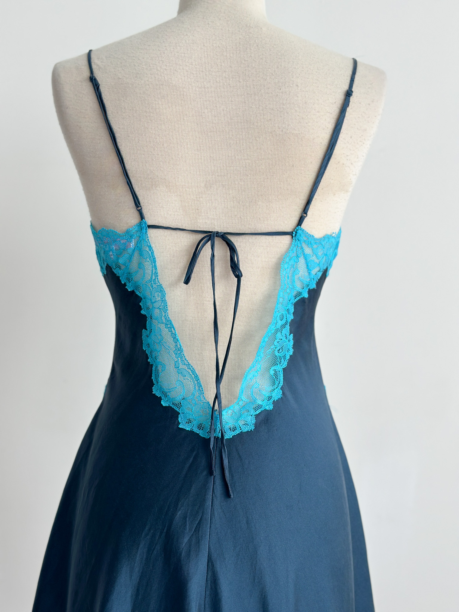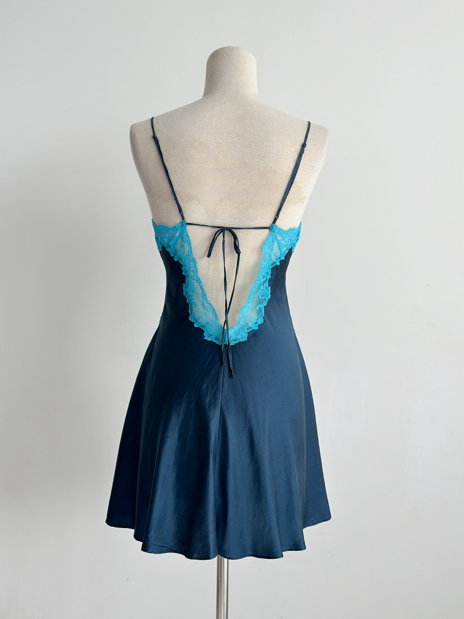Wrap yourself in timeless elegance with this Victoria's Secret silk slip dress, crafted from luxurious silk, this dress features an exquisite contrast between a deep navy hue and delicate aqua lace detailing. The neckline is adorned with intricate lace appliqué, creating a captivating focal point that enhances the romantic essence of the piece. Has a back tie that can be adjusted according to your bust & waist size. The smooth, flowing silk drapes gracefully around your silhouette, with a mini slit design. Features adjustable straps.