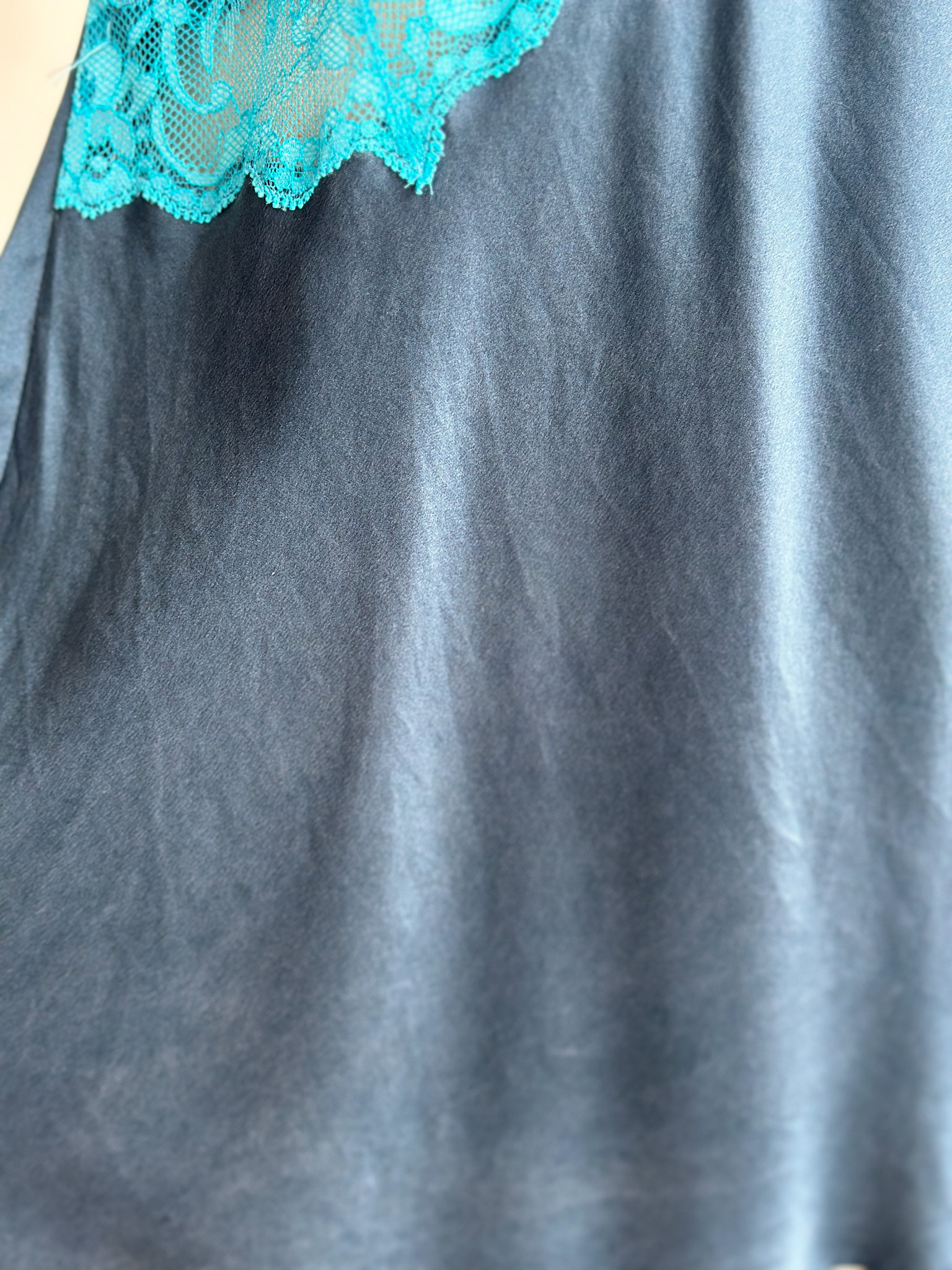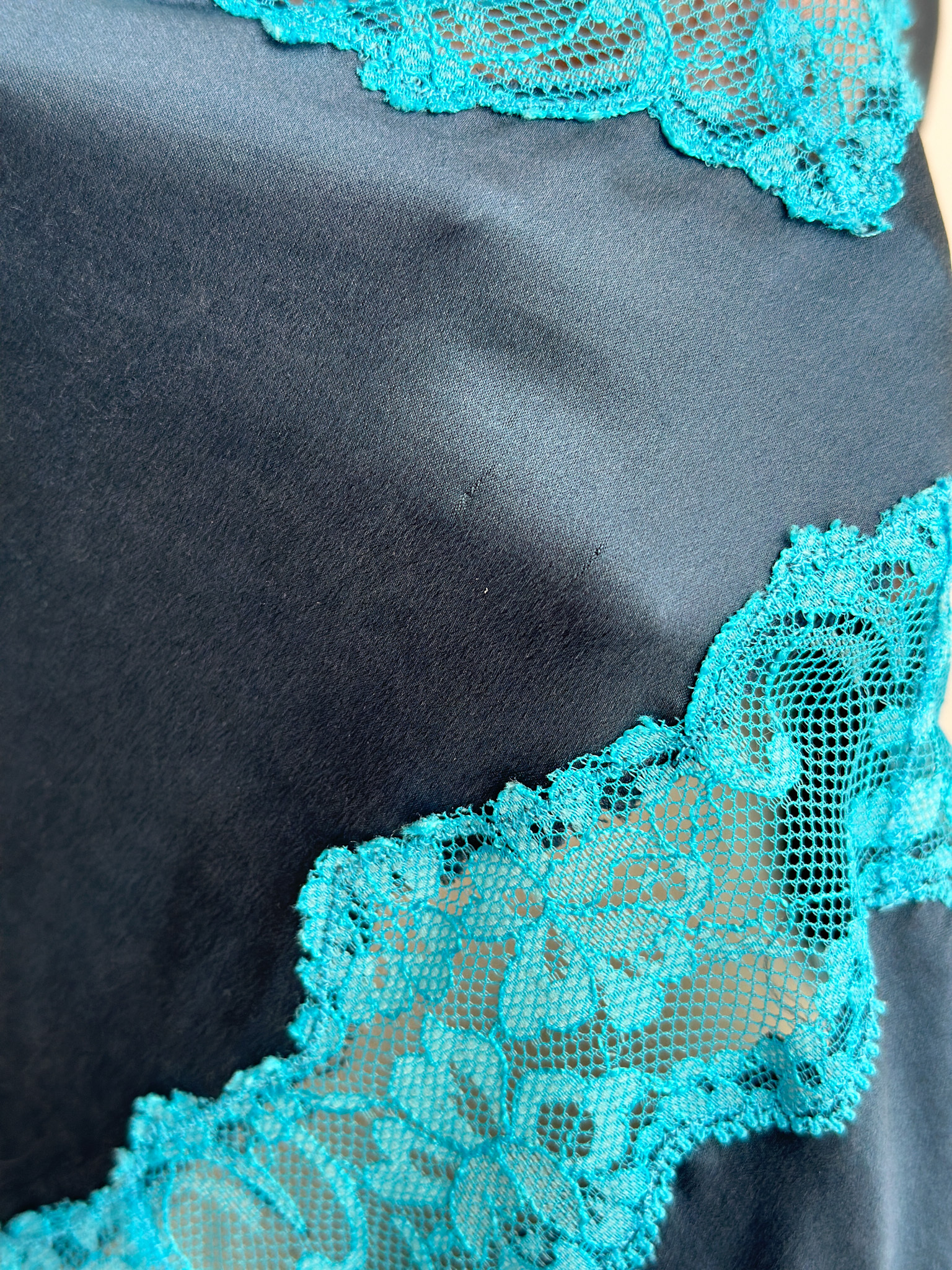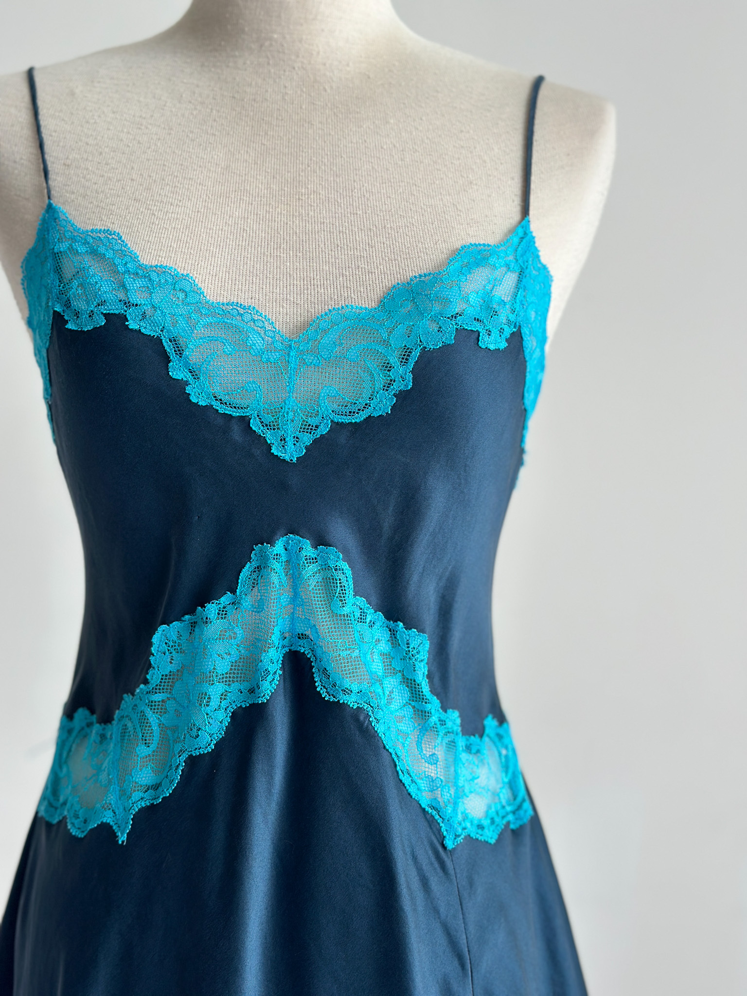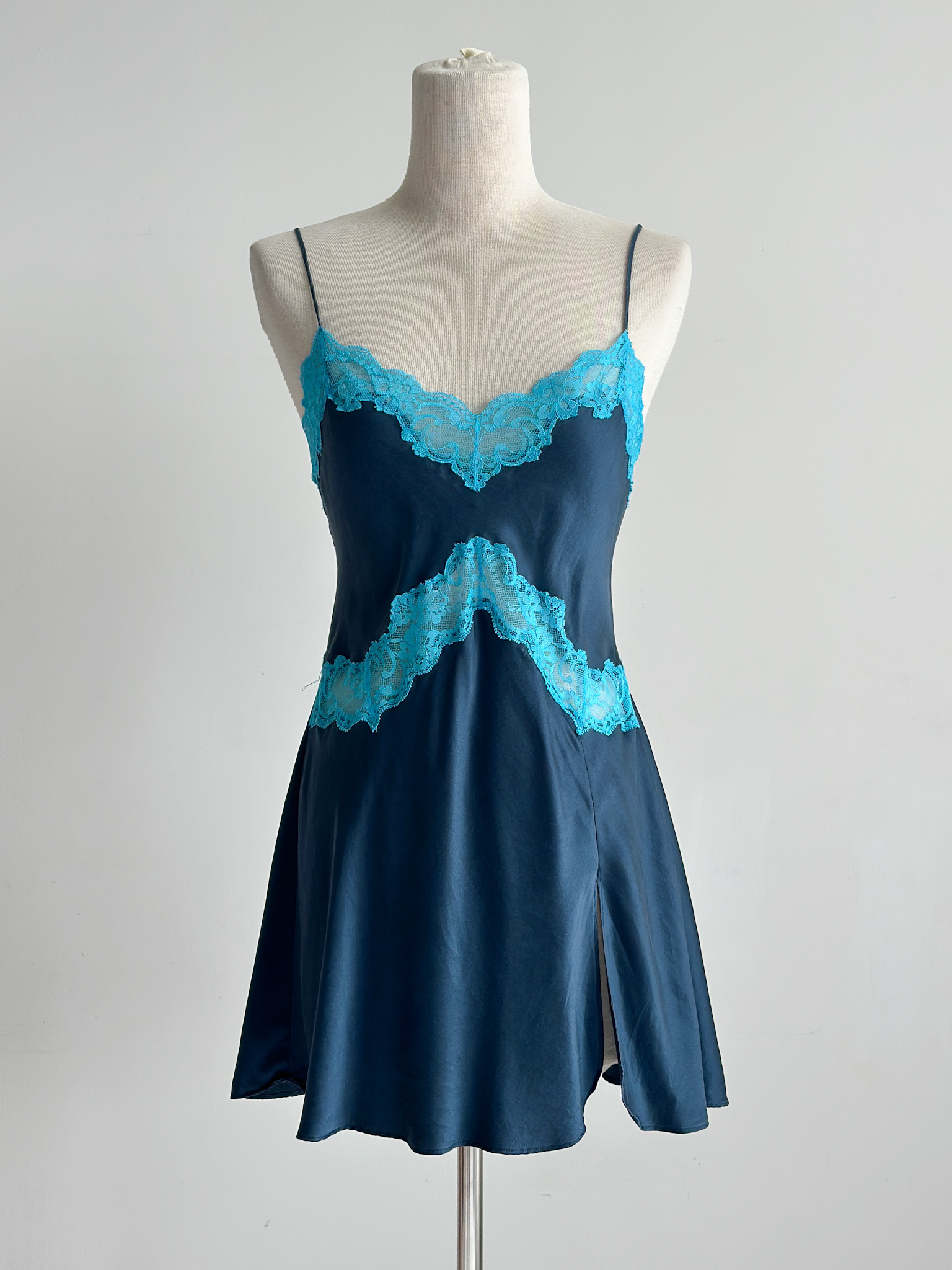 Wrap yourself in timeless elegance with this Victoria's Secret silk slip dress, crafted from luxurious silk, this dress features an exquisite contrast between a deep navy hue and delicate aqua lace detailing. The neckline is adorned with intricate lace appliqué, creating a captivating focal point that enhances the romantic essence of the piece. Has a back tie that can be adjusted according to your bust & waist size. The smooth, flowing silk drapes gracefully around your silhouette, with a mini slit design. Features adjustable straps.